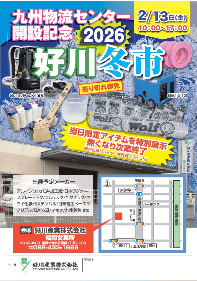 来る2026年2月13日(金)に福岡市博多区の好川産業株式会社福岡営業所にて「九州物流センター開設記念2026好川冬市」の開催が決定した事をお知らせします。